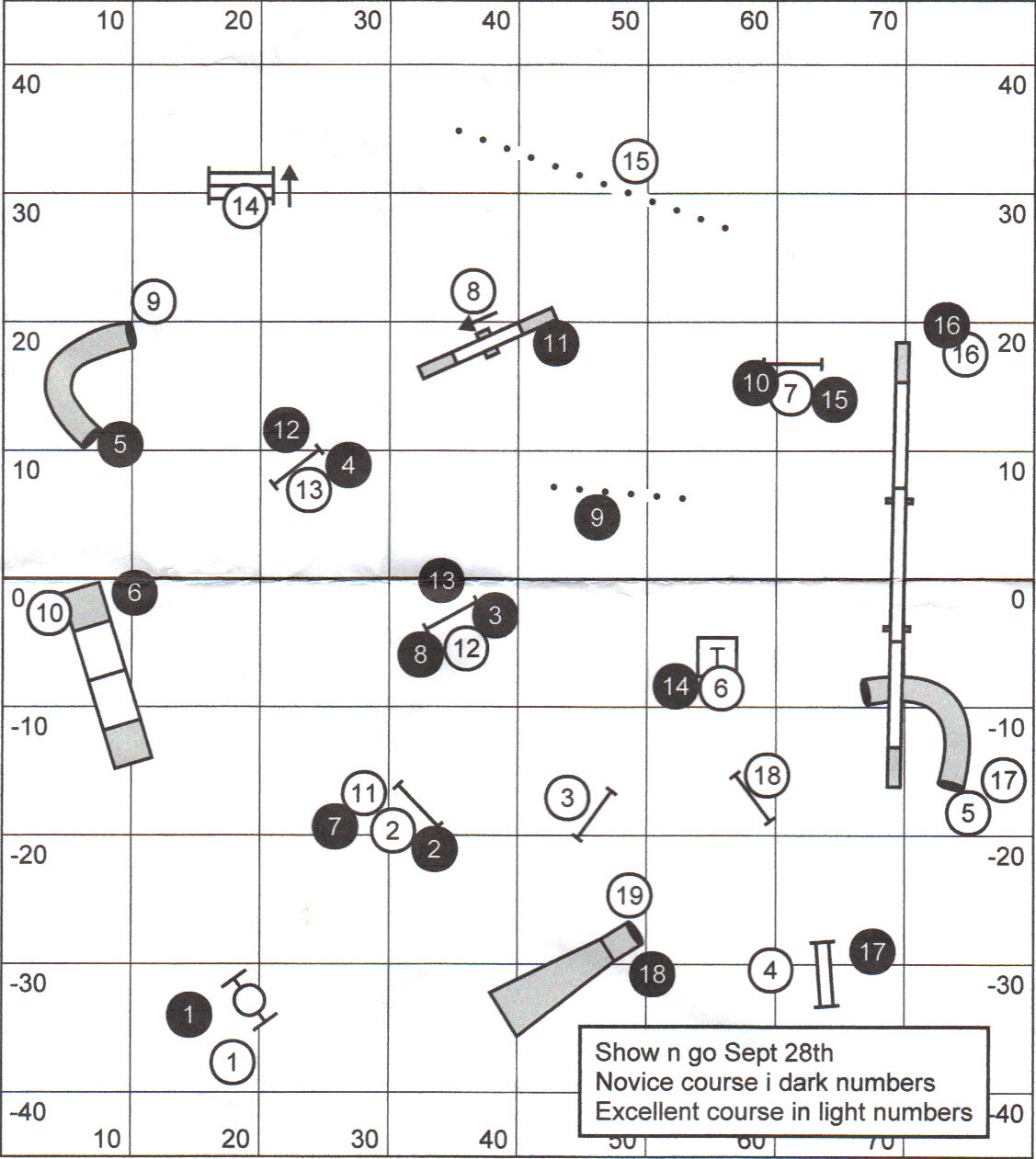 Here is the Standard course they set up, the novice course were the dark circles. After walking the course and talking with my friends, at 4 and 5, I decided that going to the close end of the tunnel was going to be too hard for a green dog like Riley, so I decided to go to the far side, and besides the sniffing it worked out really well.